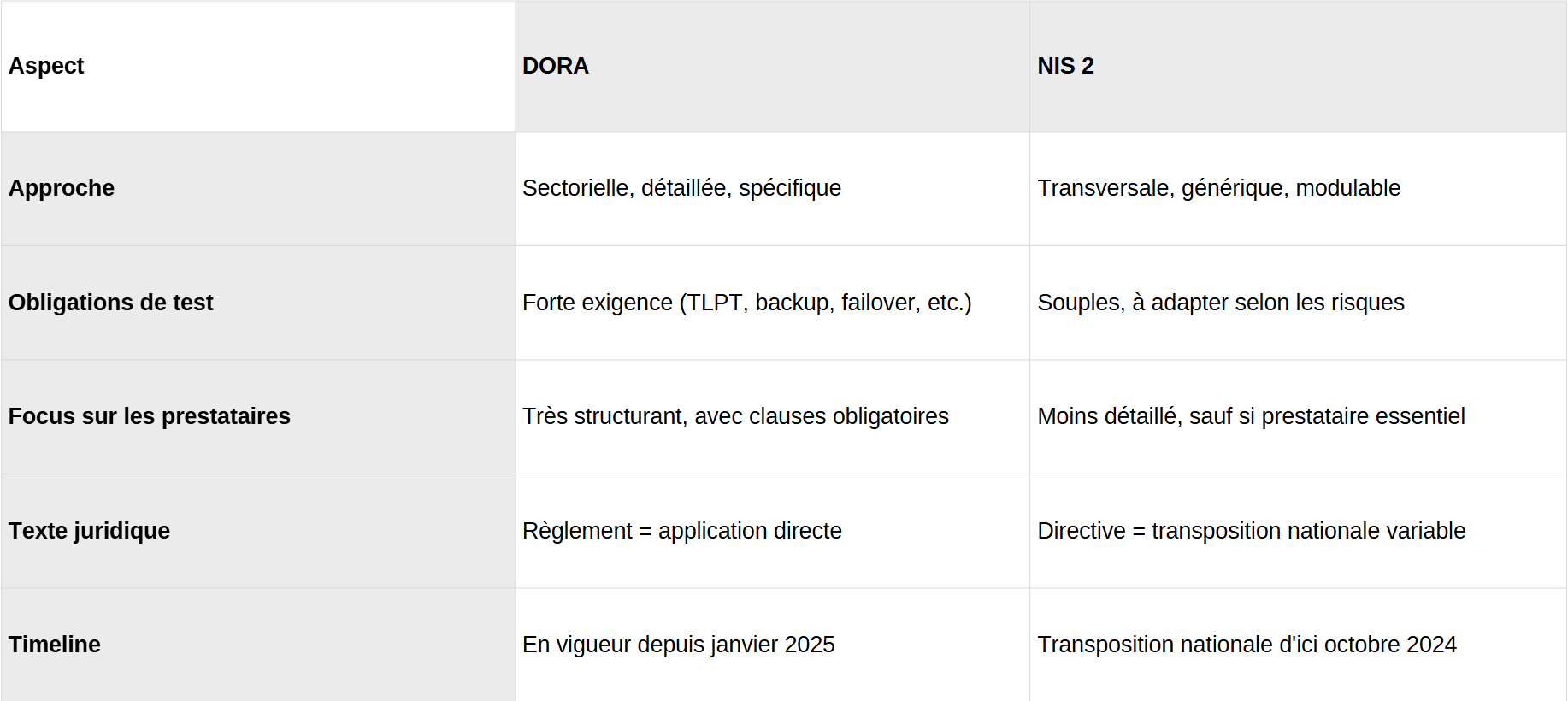 - DORA se concentre sur la continuité d’activité, les tests, la gestion des tiers et la réponse aux incidents numériques spécifiques au secteur financier.